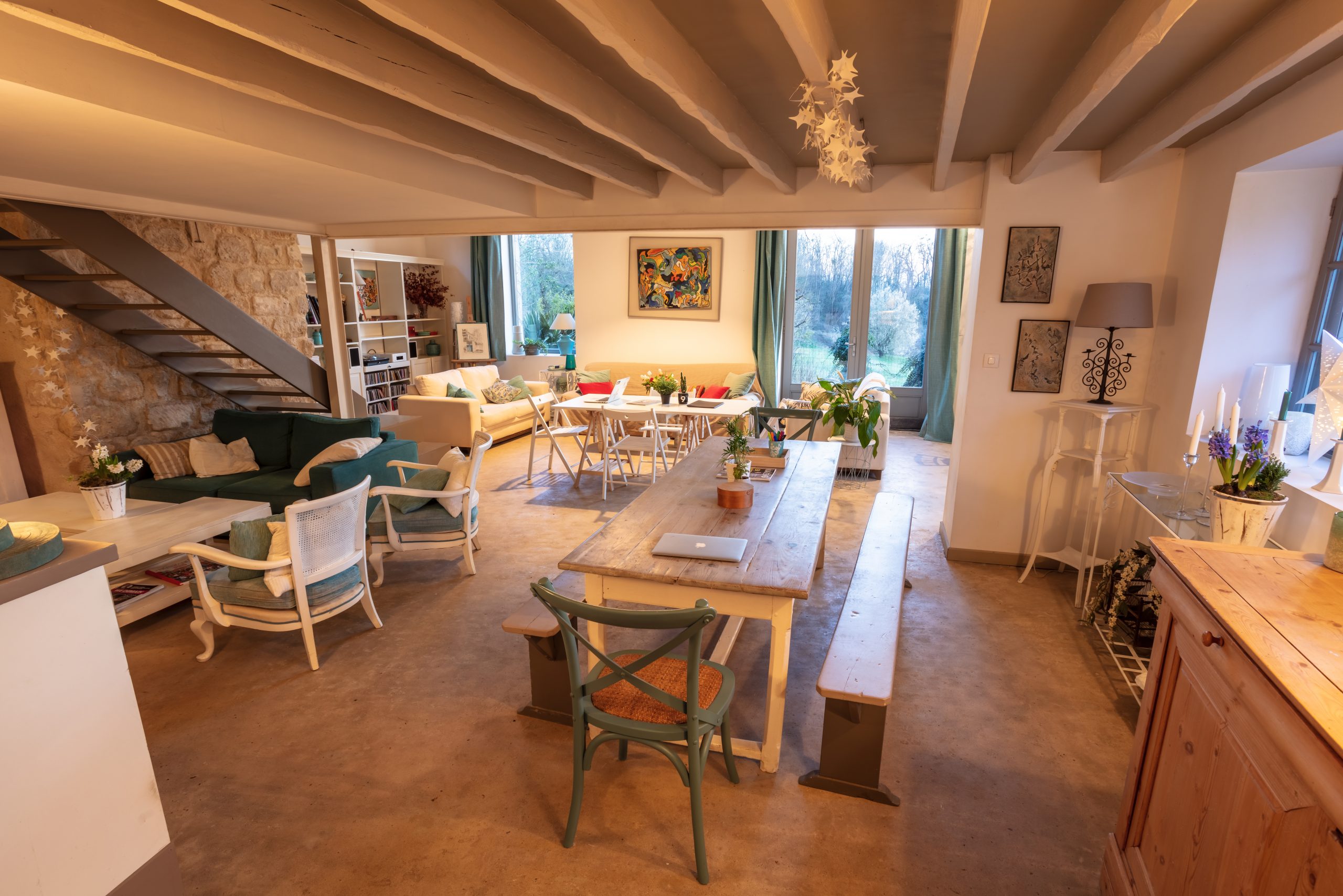 Cette maison, ancienne ferme rénovée, aux volumes généreux, à la lumière traversante à tout moment de la journée, située dans un cadre naturel préservé, avait tous les atouts pour se transformer en lieu de réception, tout en restant une maison habitée.