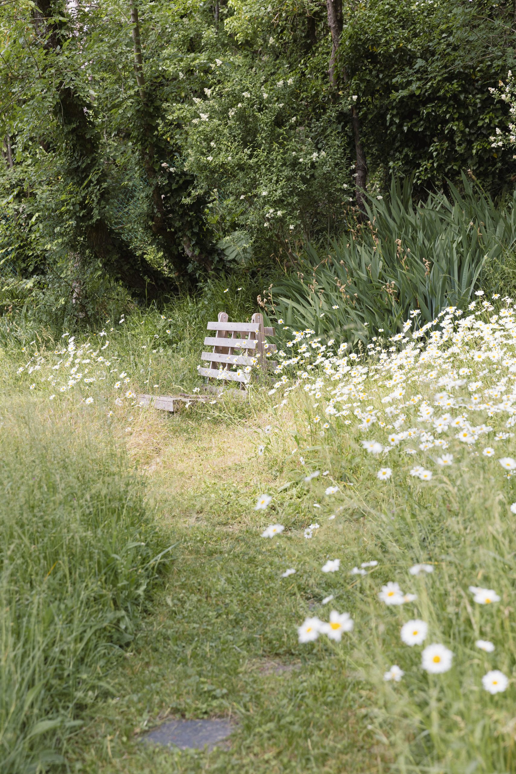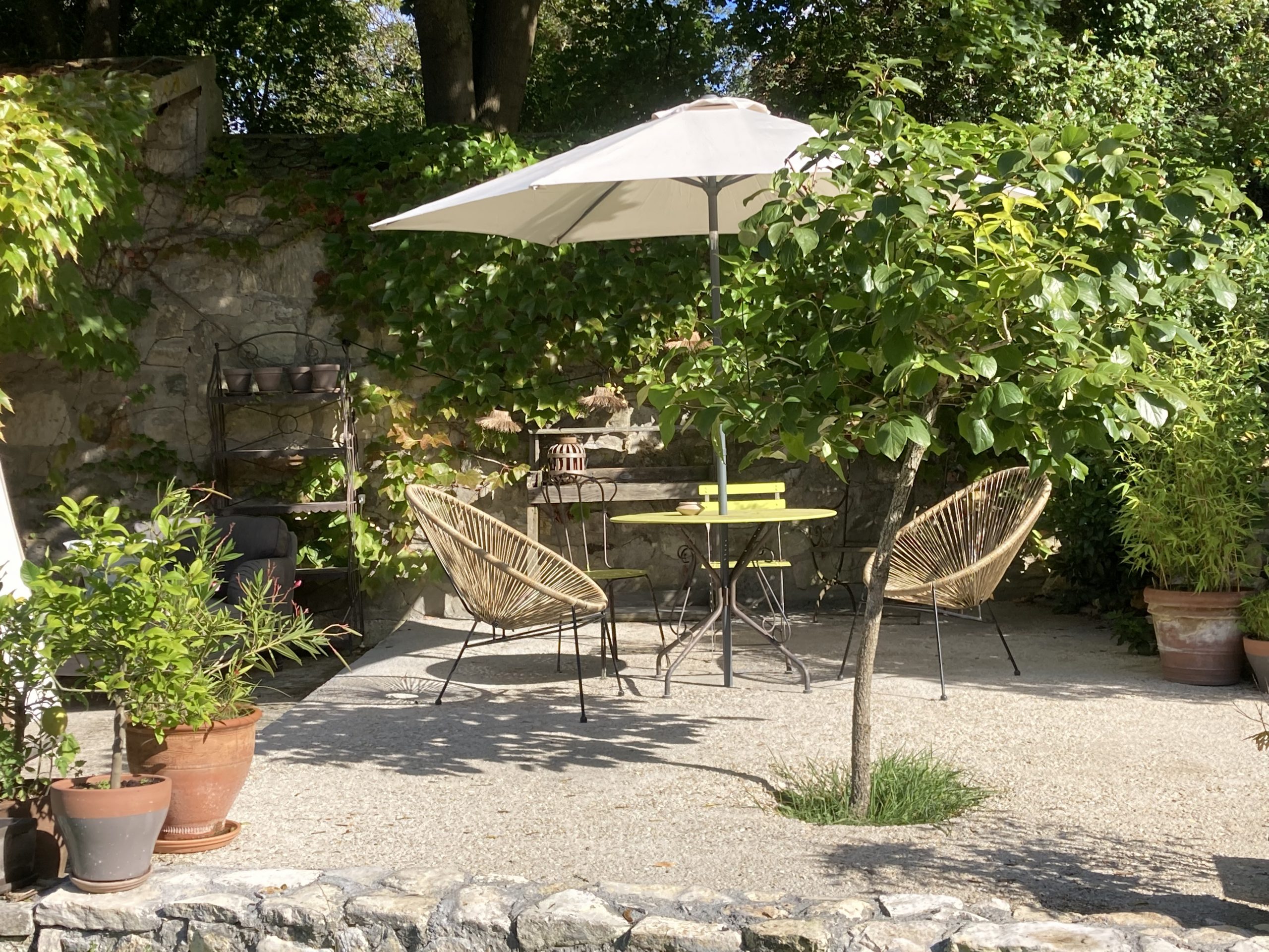Jardin arboré de 3000 m2 avec terrasses et espaces aménagés pour des regroupements, déjeuners et activités d’extérieur.